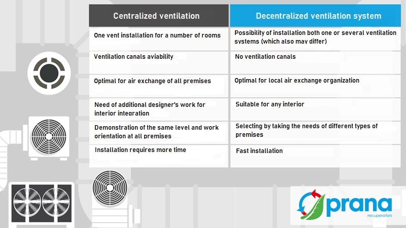 Usually, centralized (general exchange) ventilation provides air exchange for a number of rooms with one powerful air handling unit. For such system it is necessary to install a network of ducts. Ventilation unit itself has quite large dimensions and often requires a separate room for equipment. Currently, centralized ventilation systems are losing popularity due to the emergence of decentralized (local) ventilation systems.