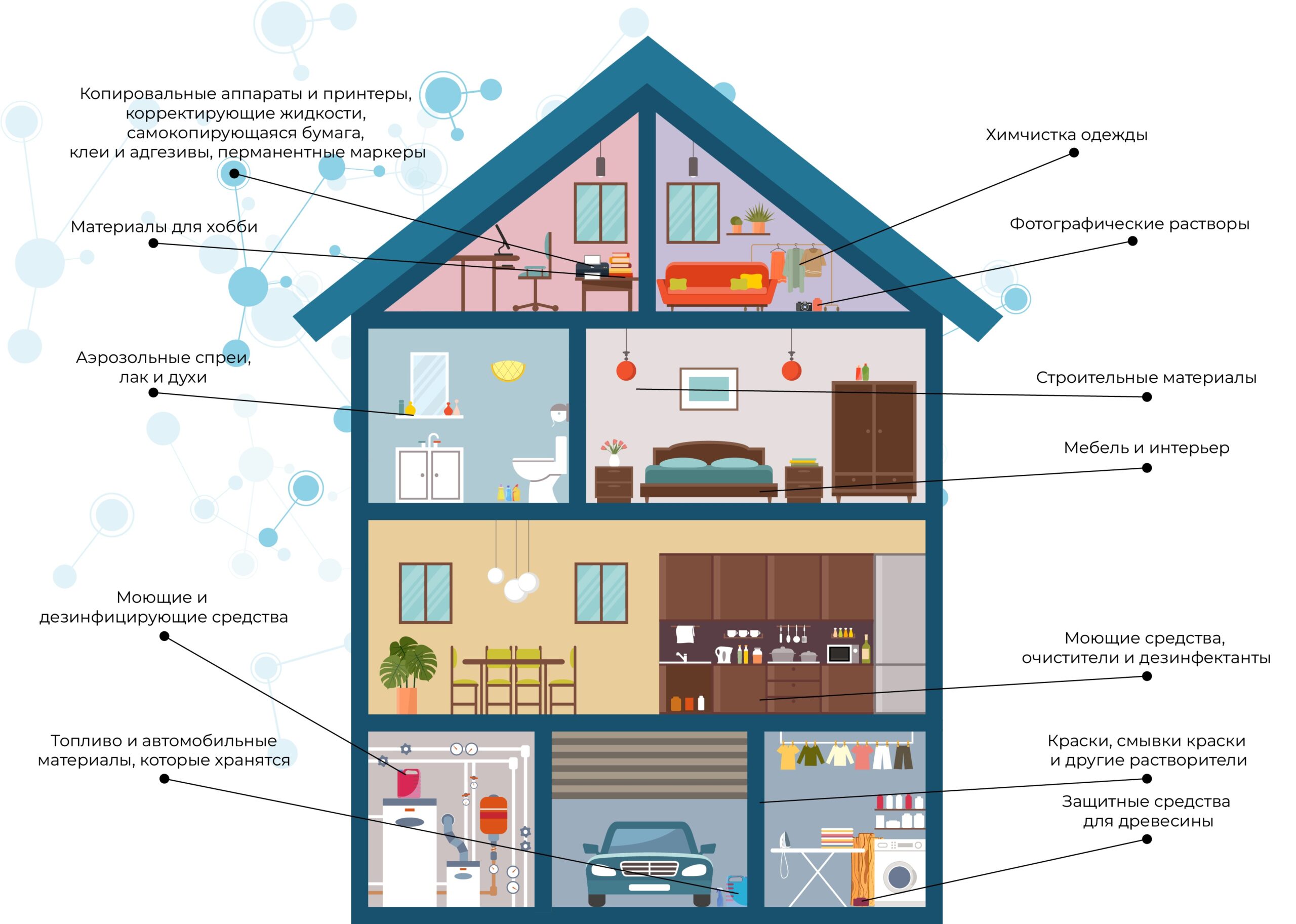 В помещениях источниками образования ЛОС могут быть мебель, краски, клей, табак, спреи, аэрозоли, парфюмерия, чистящие средства, дезинфицирующие средства, освежители воздуха, выхлопные газы, копировальные аппараты и принтеры и др. Также источниками ЛОС являются люди и животные. Данные вещества выделяются во время нашего дыхания, выделения пота и других процессов жизнедеятельности. При повышении температуры и влажности в помещении процесс выделения летучих органических соединений происходит еще интенсивнее.